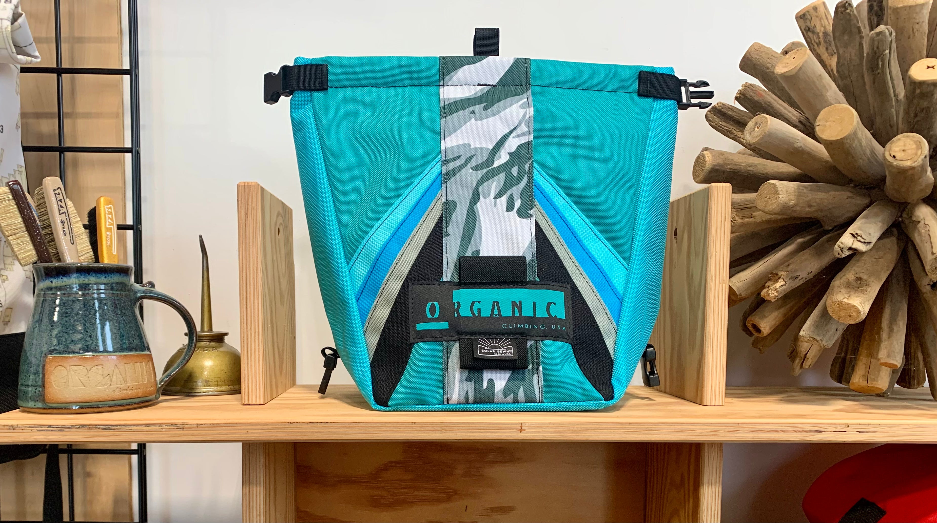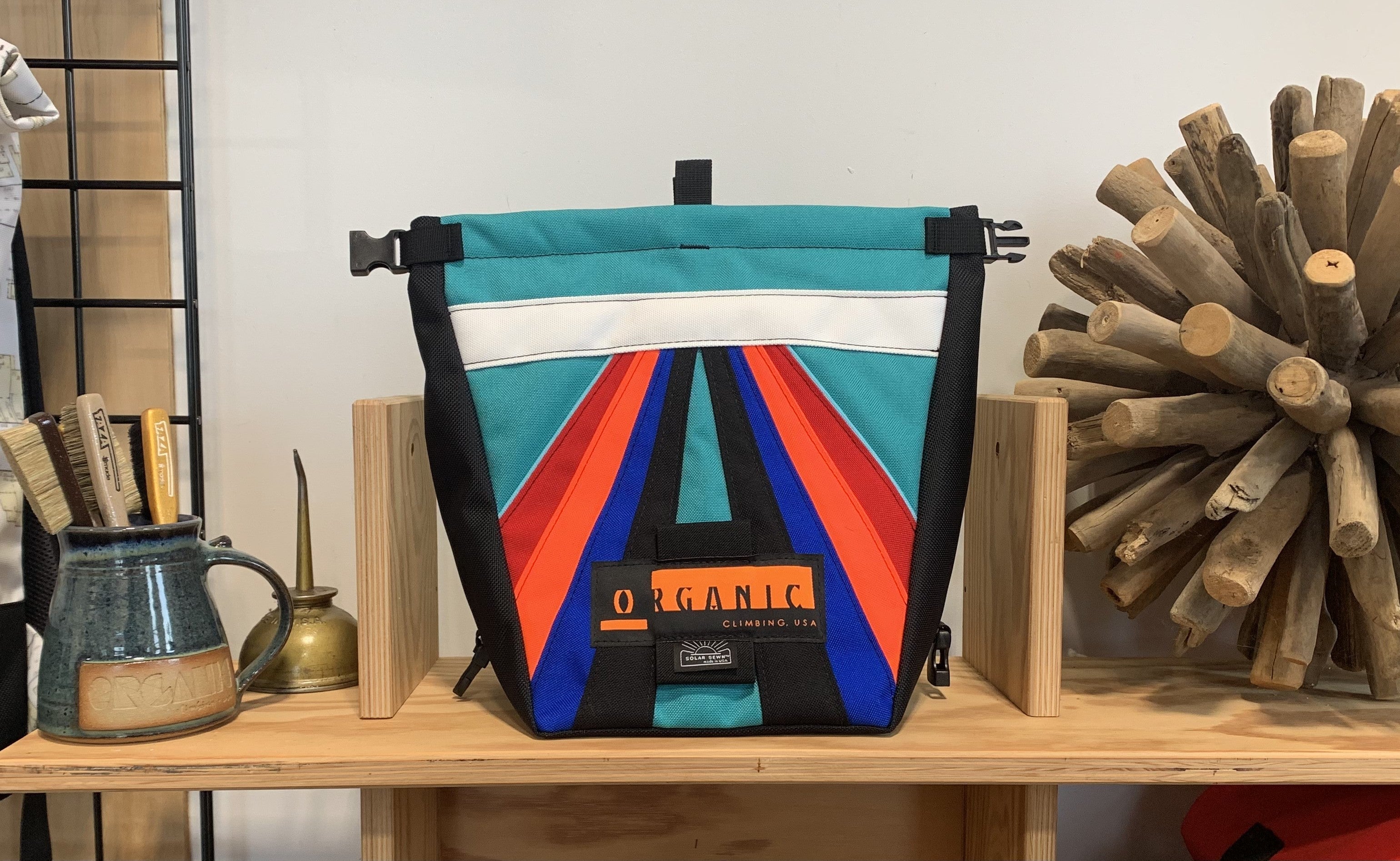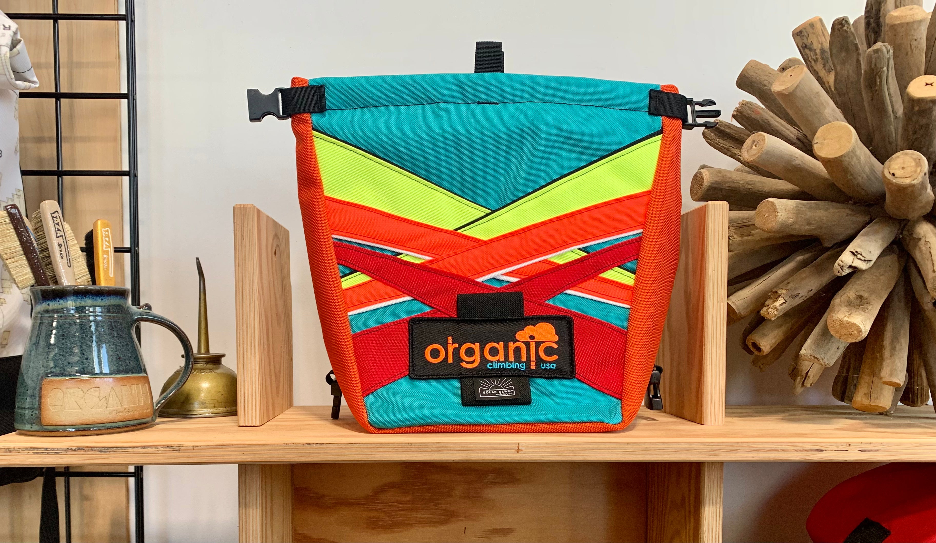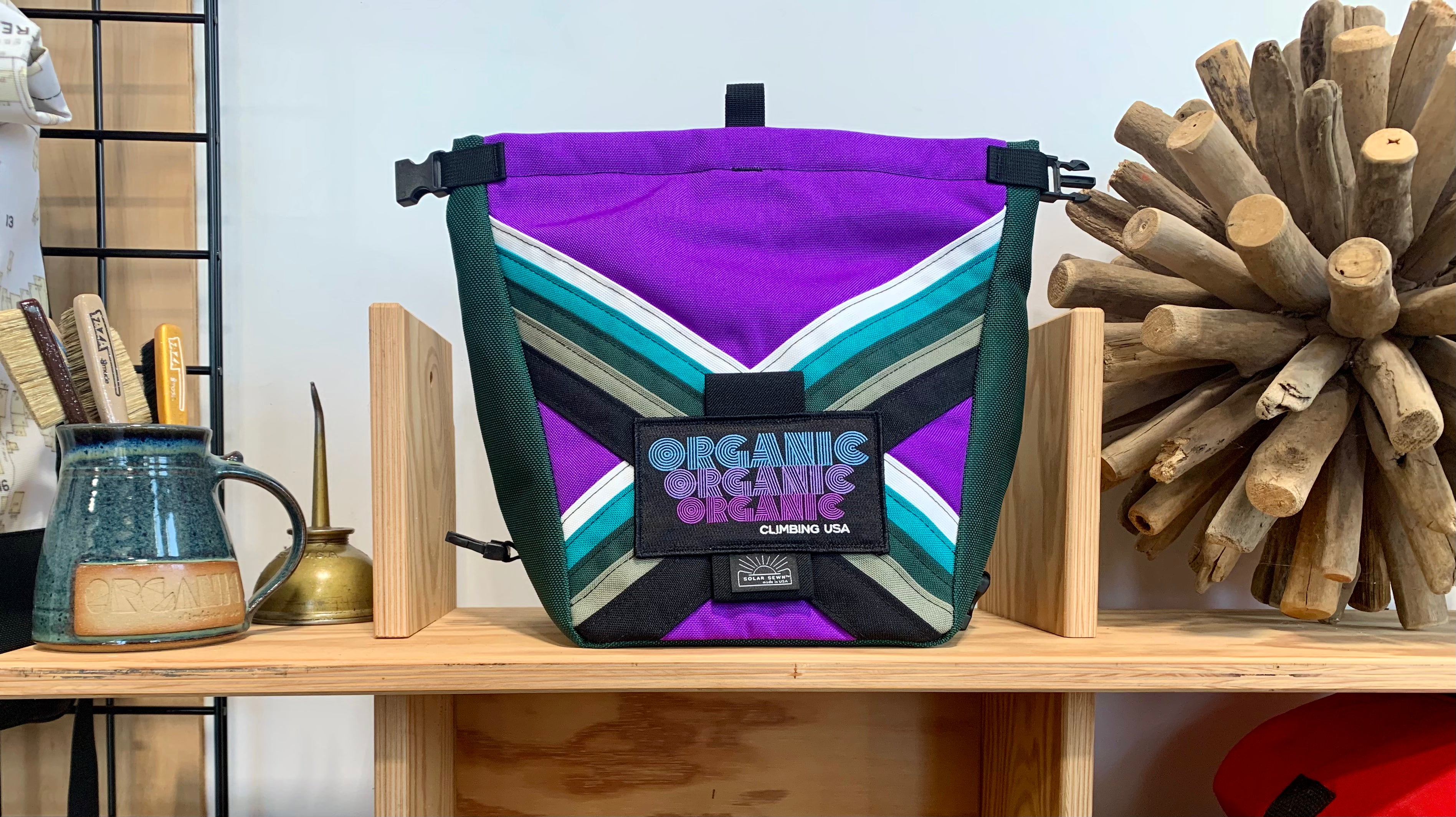 Developed through 14 years of feedback from devoted ORGANIC users worldwide! Our Deluxe Chalk Bucket has many tricks up its sleeve! Constructed of burly and colorful 1200d Recycled Cordura with a wrap around panel (sides and bottom) of indestructible 1050 Ballistic Nylon for added durability and stiffness along the bottom and sides of the bag. 2 Horizontal brush holders on front of bag for standard size brushes and 2 vertical sewn pockets on the back for larger, thicker handled brushes. Double pocket (One with zipper with ample room for wallet, phone, keys etc) and a shove it style pocket build in behind the zippered pocket, designed to hold phone upright when utilizing training apps etc, and with sewn in brush slots to keep your brushes at the ready. Super soft fleece lined throughout bag, large bar tack reinforced grab handle on back of bag for easy grabbing between burns. 1" Hook and Loop closure along the rim, Rolls down and securely clips closed to seal chalk in tight!