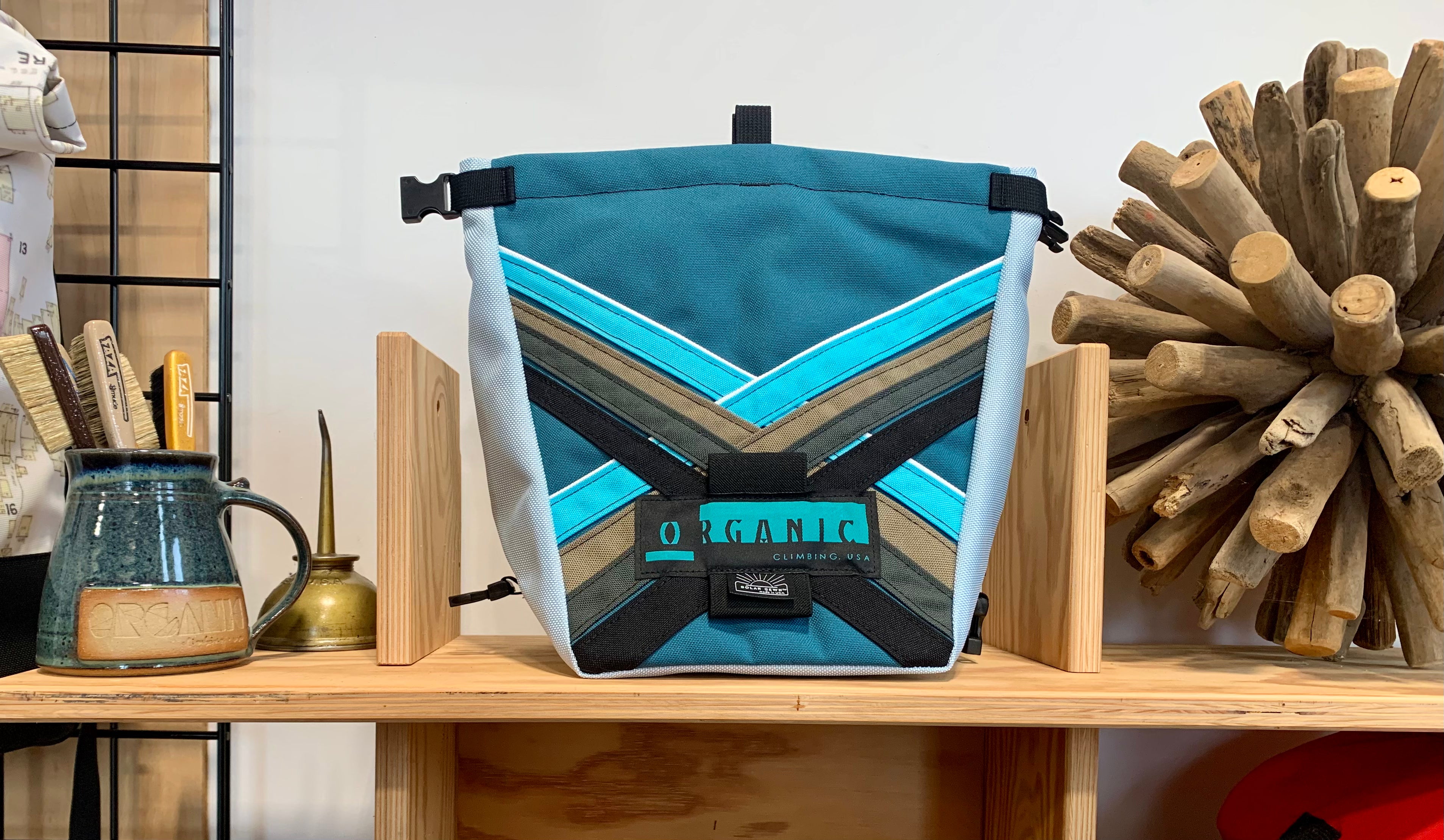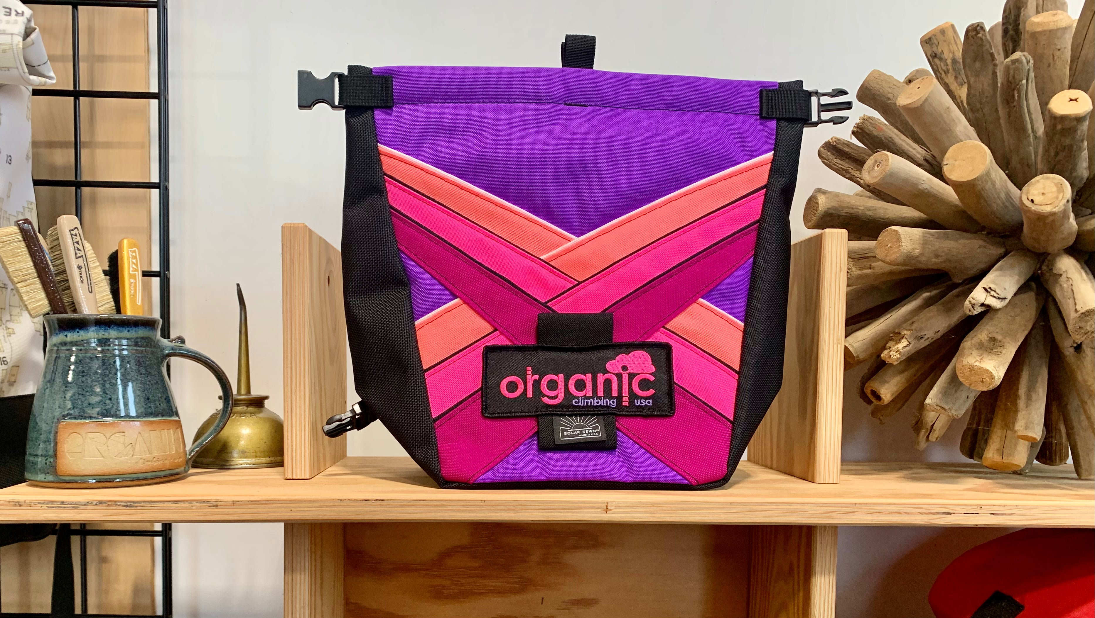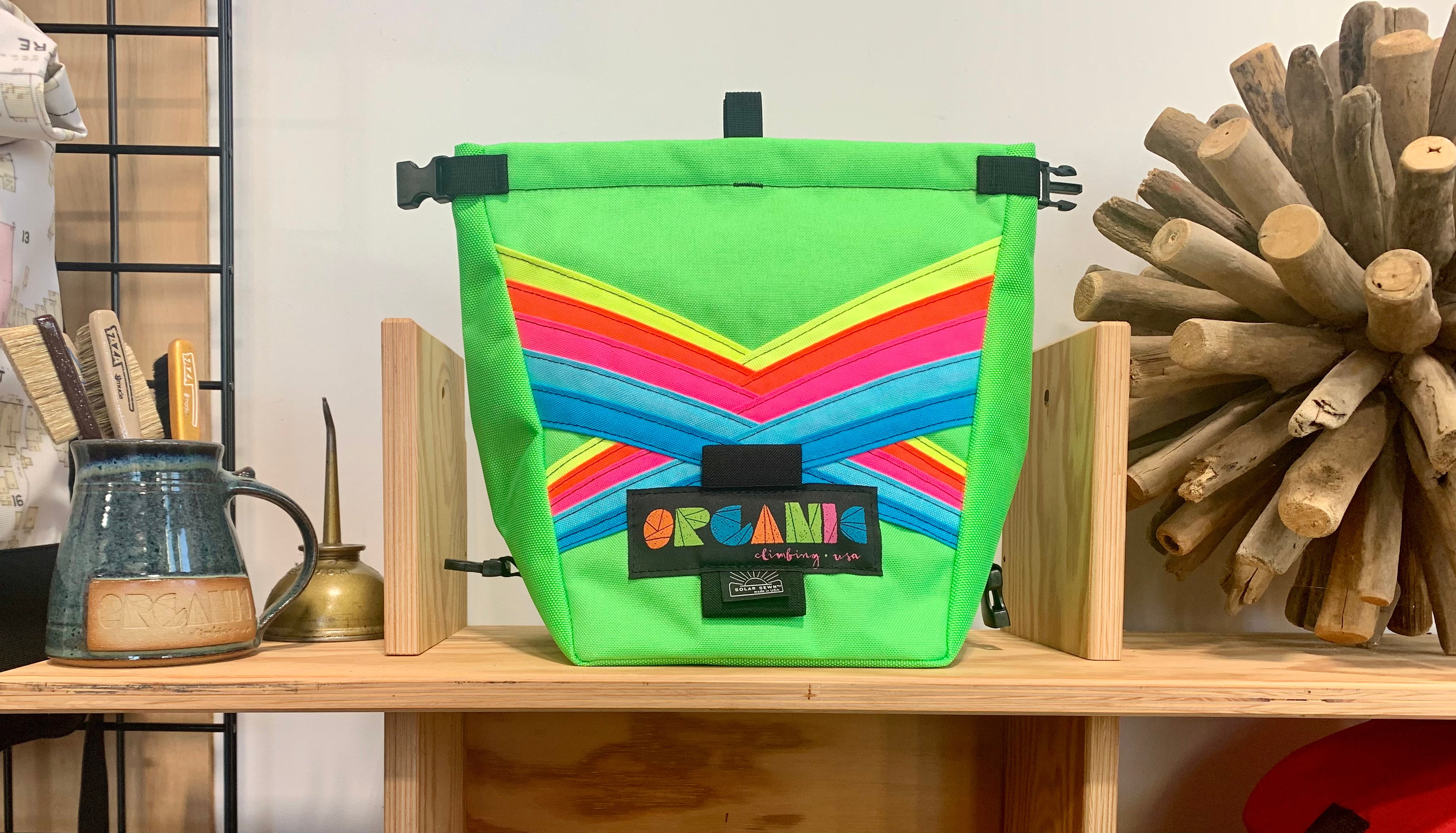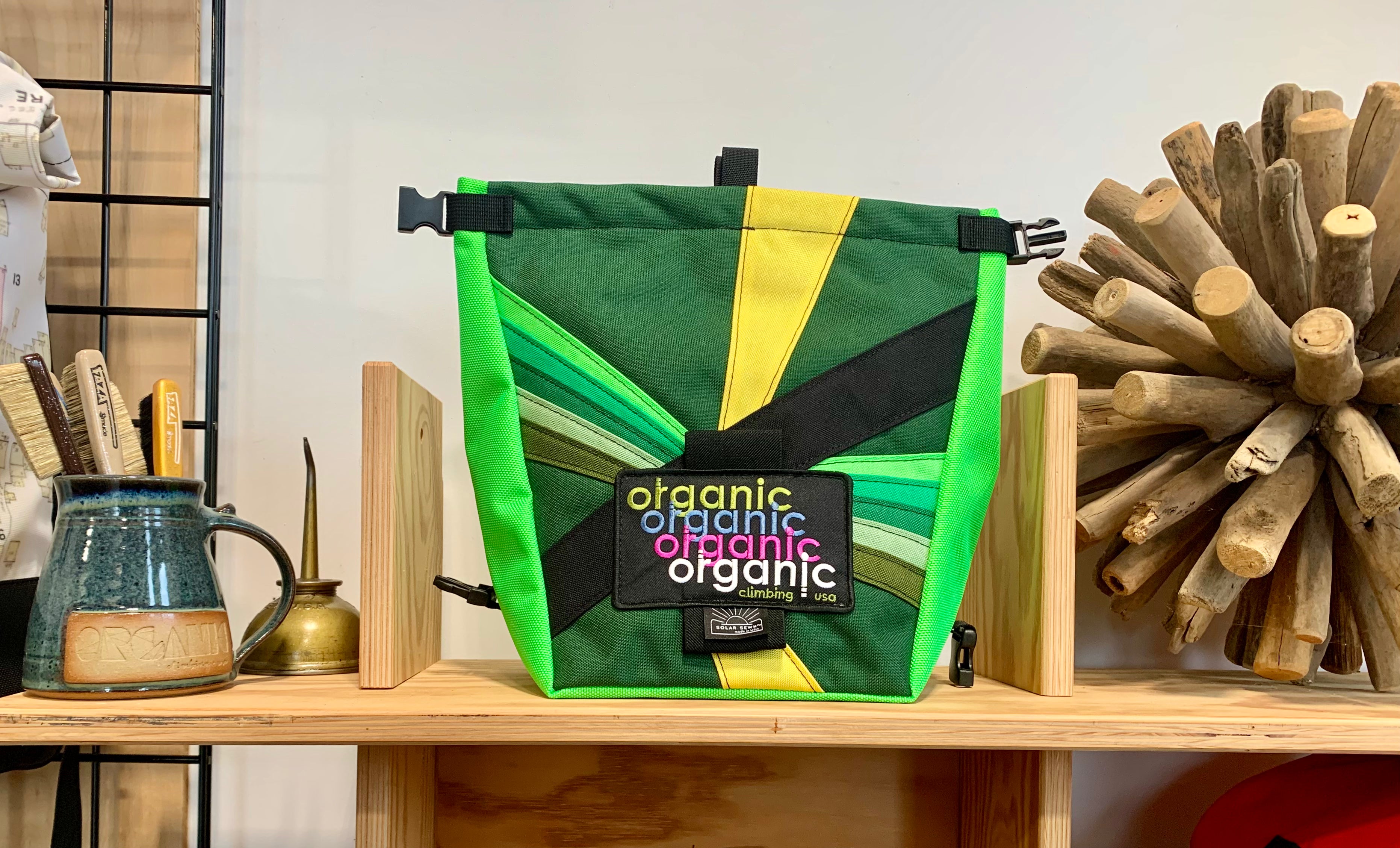 Developed through 14 years of feedback from devoted ORGANIC users worldwide! Our Deluxe Chalk Bucket has many tricks up its sleeve! Constructed of burly and colorful 1200d Recycled Cordura with a wrap around panel (sides and bottom) of indestructible 1050 Ballistic Nylon for added durability and stiffness along the bottom and sides of the bag. 2 Horizontal brush holders on front of bag for standard size brushes and 2 vertical sewn pockets on the back for larger, thicker handled brushes. Double pocket (One with zipper with ample room for wallet, phone, keys etc) and a shove it style pocket build in behind the zippered pocket, designed to hold phone upright when utilizing training apps etc, and with sewn in brush slots to keep your brushes at the ready. Super soft fleece lined throughout bag, large bar tack reinforced grab handle on back of bag for easy grabbing between burns. 1" Hook and Loop closure along the rim, Rolls down and securely clips closed to seal chalk in tight!