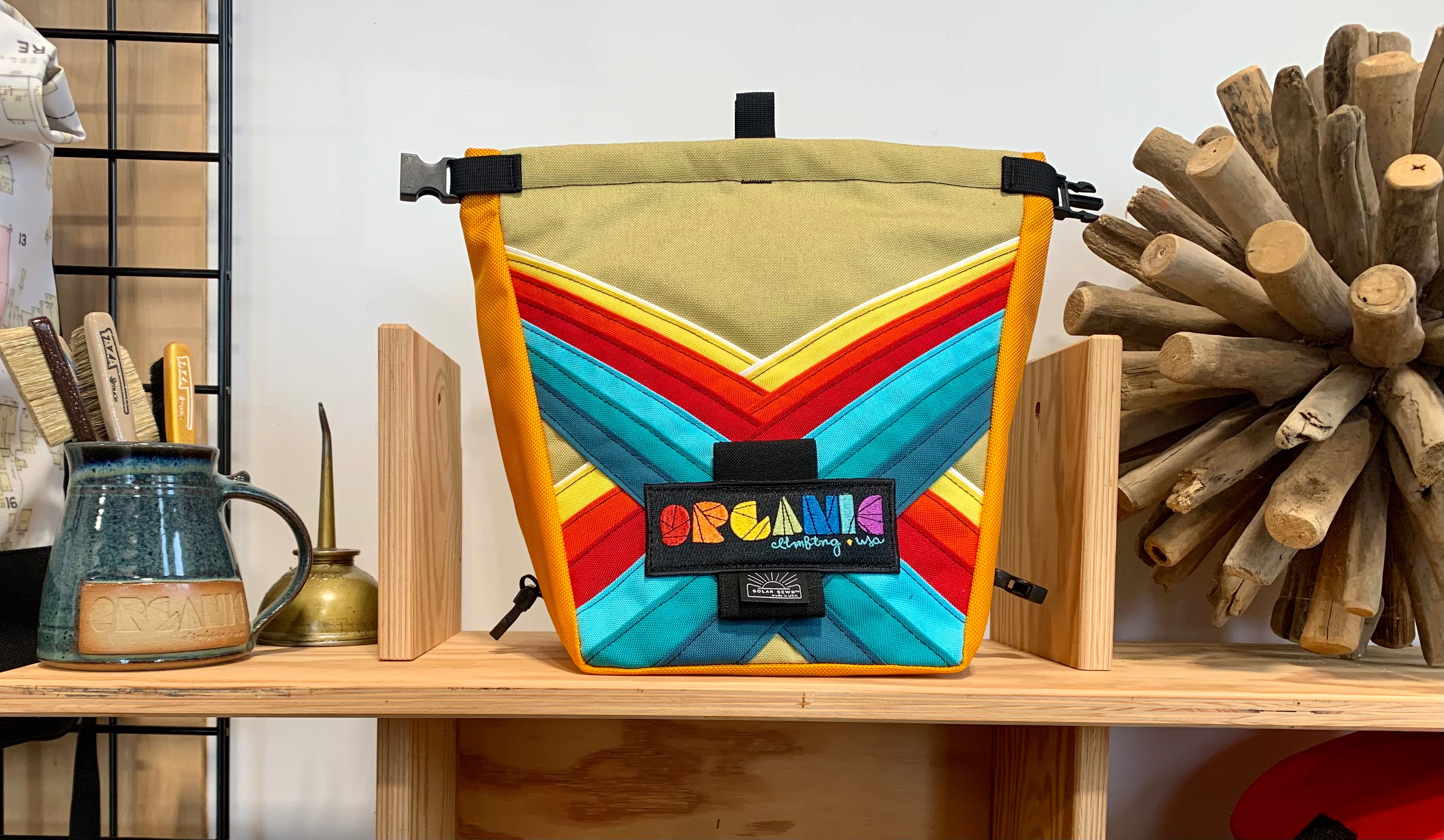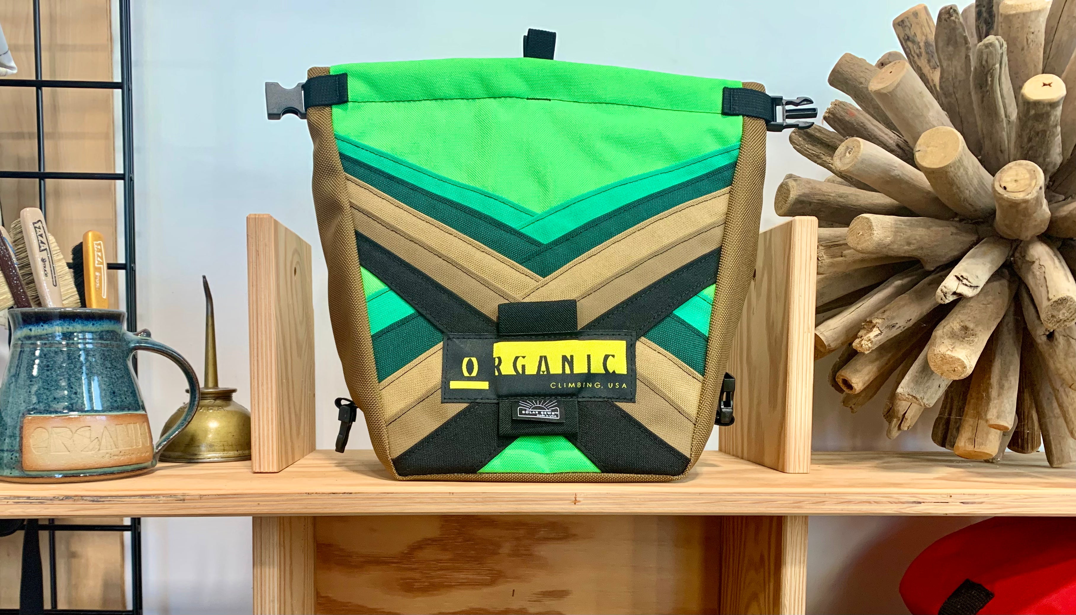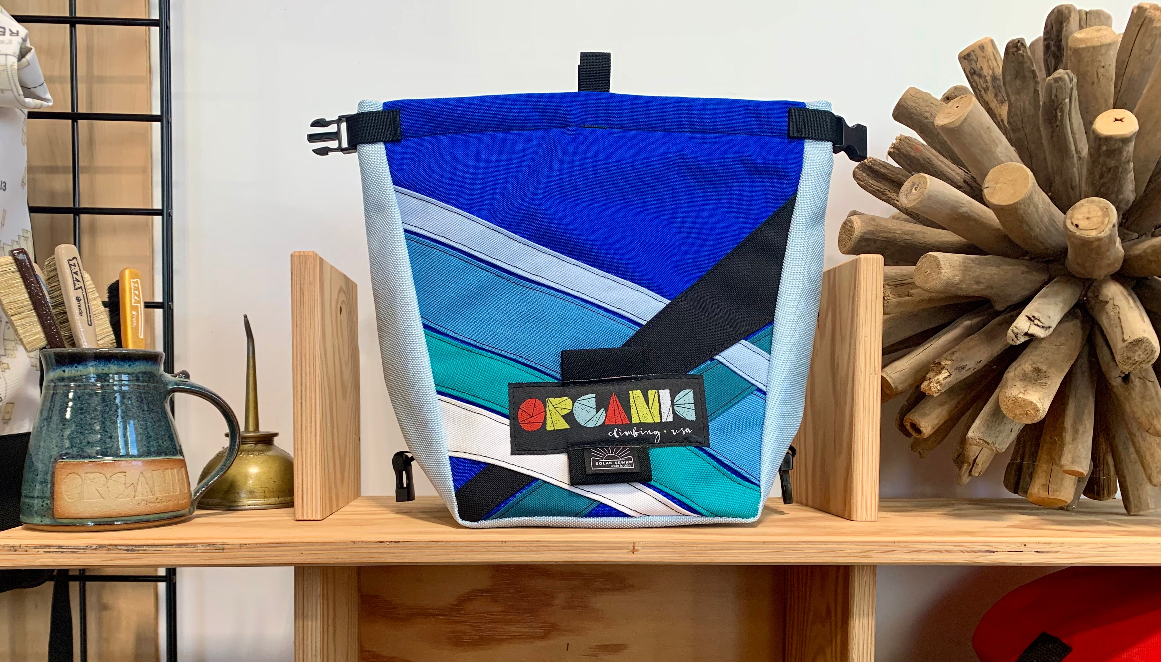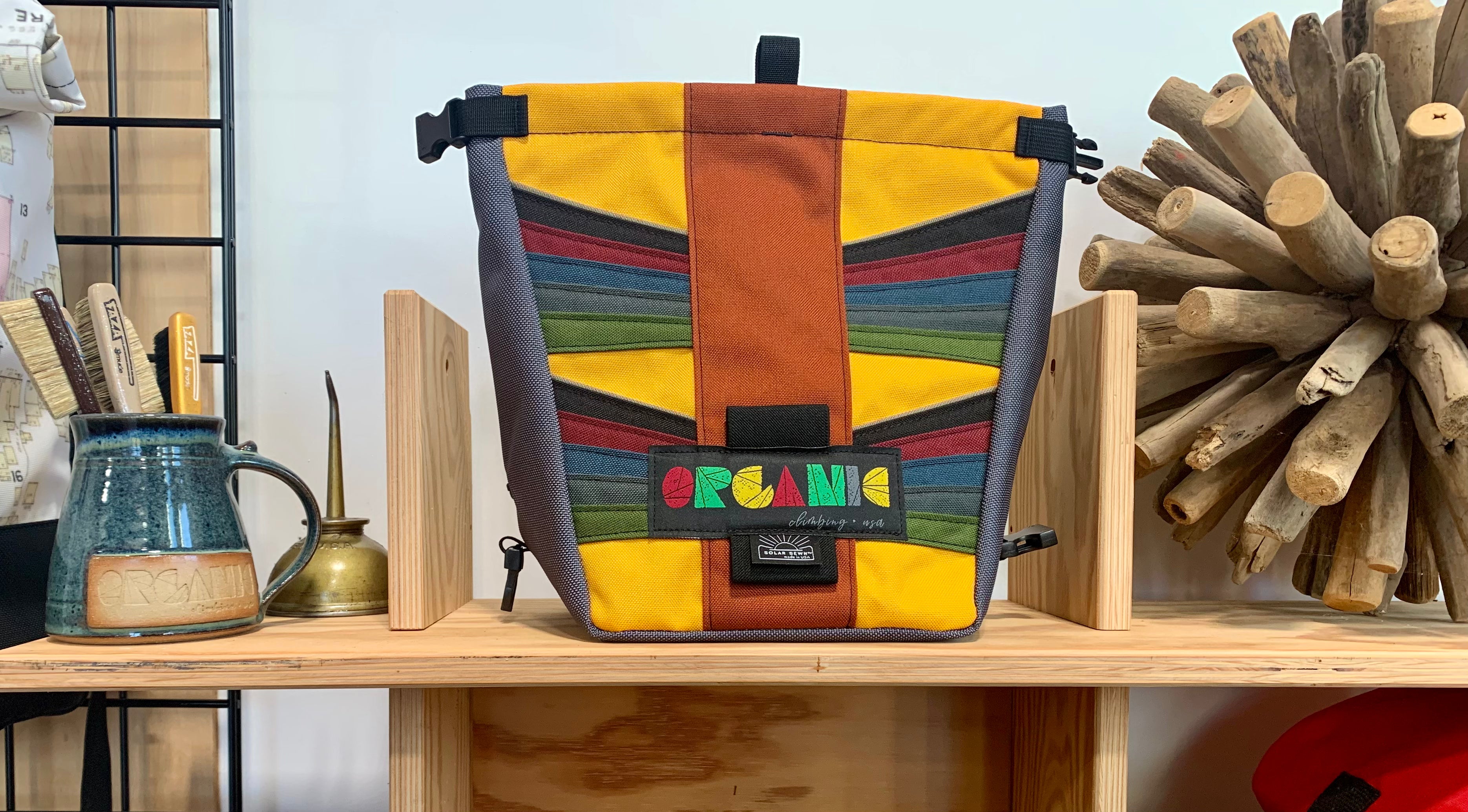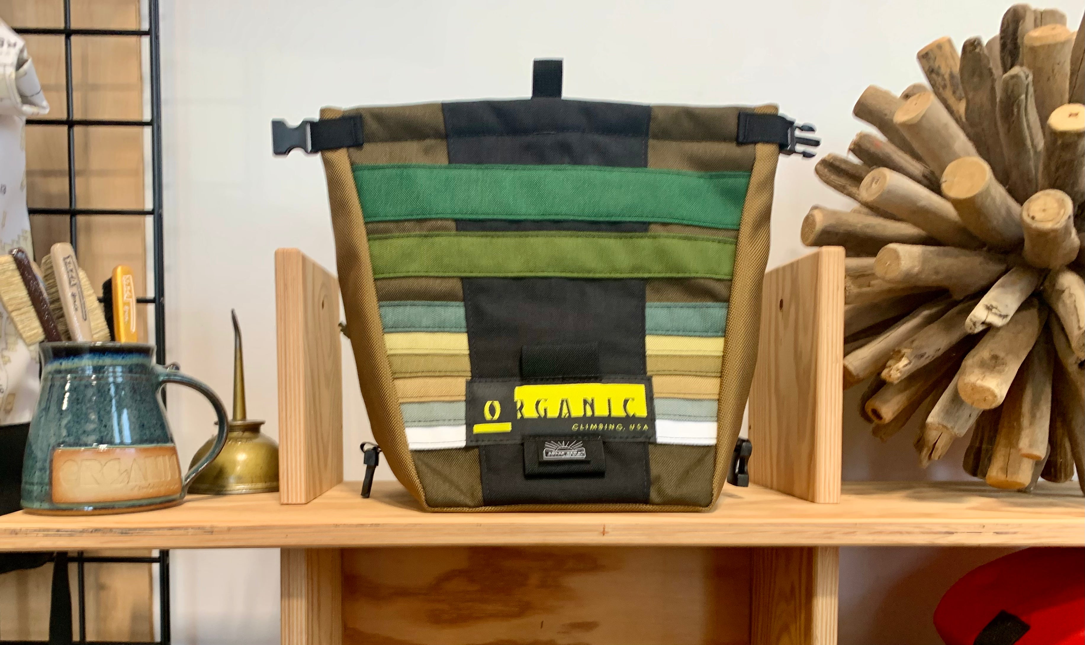 Developed through 14 years of feedback from devoted ORGANIC users worldwide! Our Deluxe Chalk Bucket has many tricks up its sleeve! Constructed of burly and colorful 1200d Recycled Cordura with a wrap around panel (sides and bottom) of indestructible 1050 Ballistic Nylon for added durability and stiffness along the bottom and sides of the bag. 2 Horizontal brush holders on front of bag for standard size brushes and 2 vertical sewn pockets on the back for larger, thicker handled brushes. Double pocket (One with zipper with ample room for wallet, phone, keys etc) and a shove it style pocket build in behind the zippered pocket, designed to hold phone upright when utilizing training apps etc, and with sewn in brush slots to keep your brushes at the ready. Super soft fleece lined throughout bag, large bar tack reinforced grab handle on back of bag for easy grabbing between burns. 1" Hook and Loop closure along the rim, Rolls down and securely clips closed to seal chalk in tight!