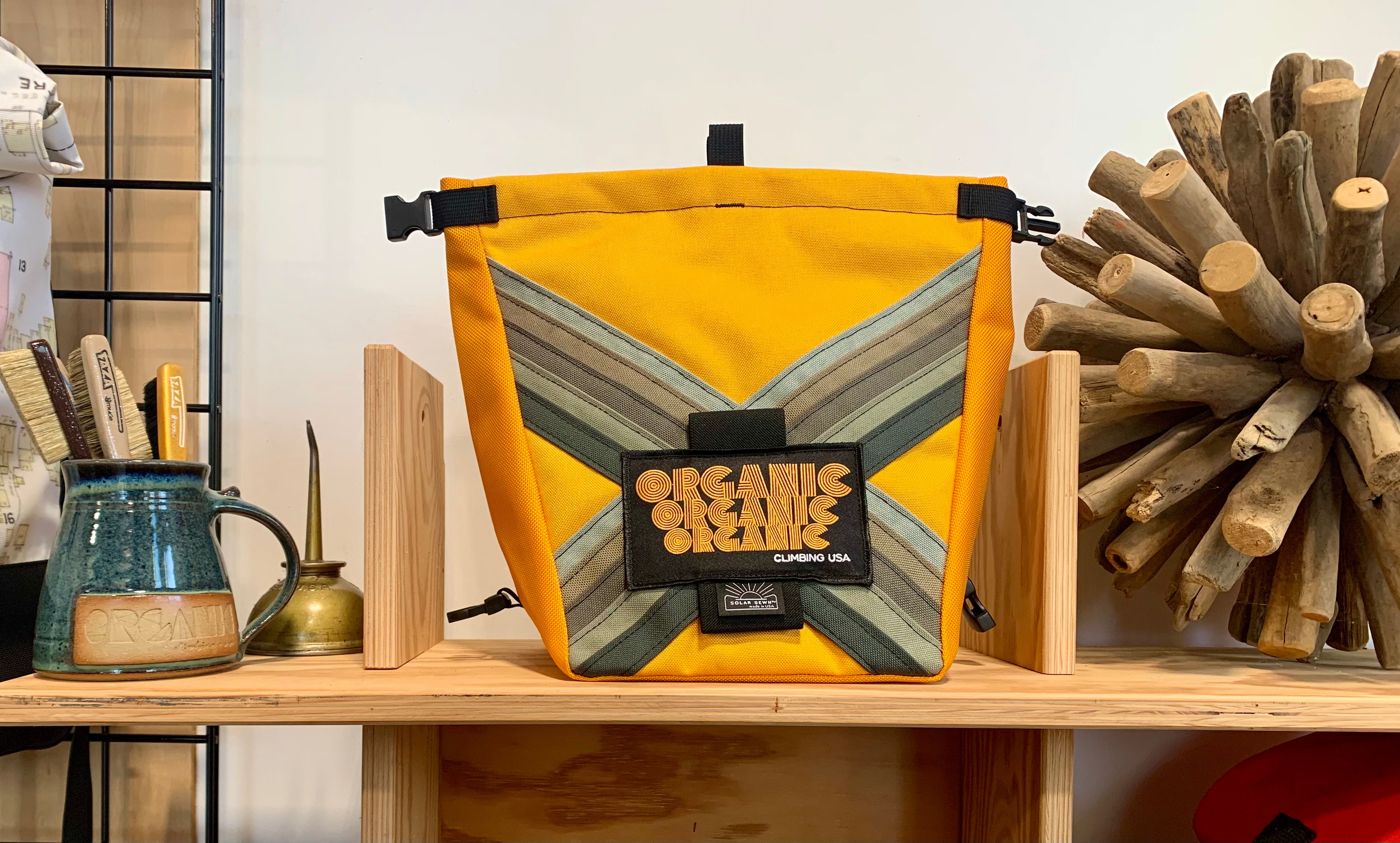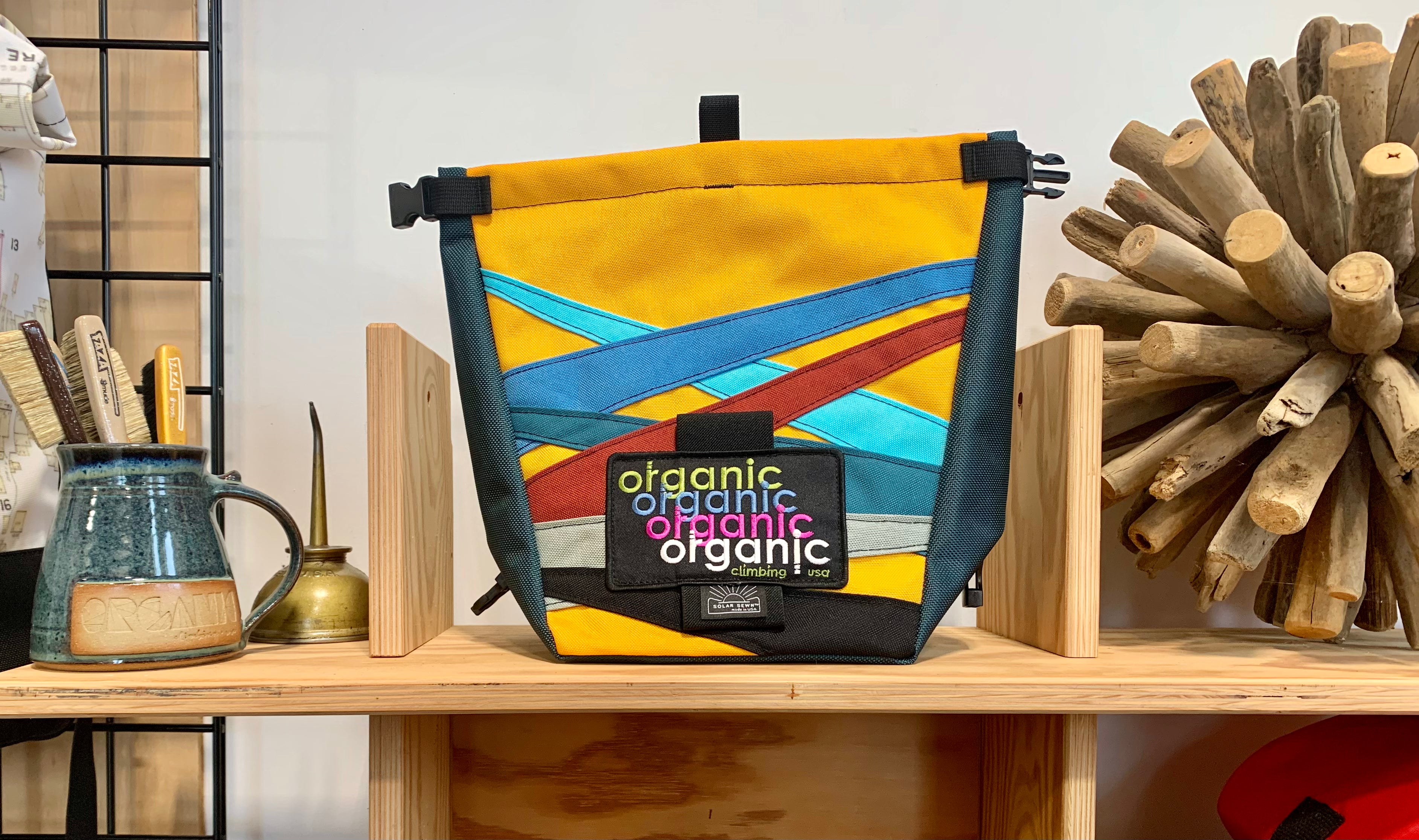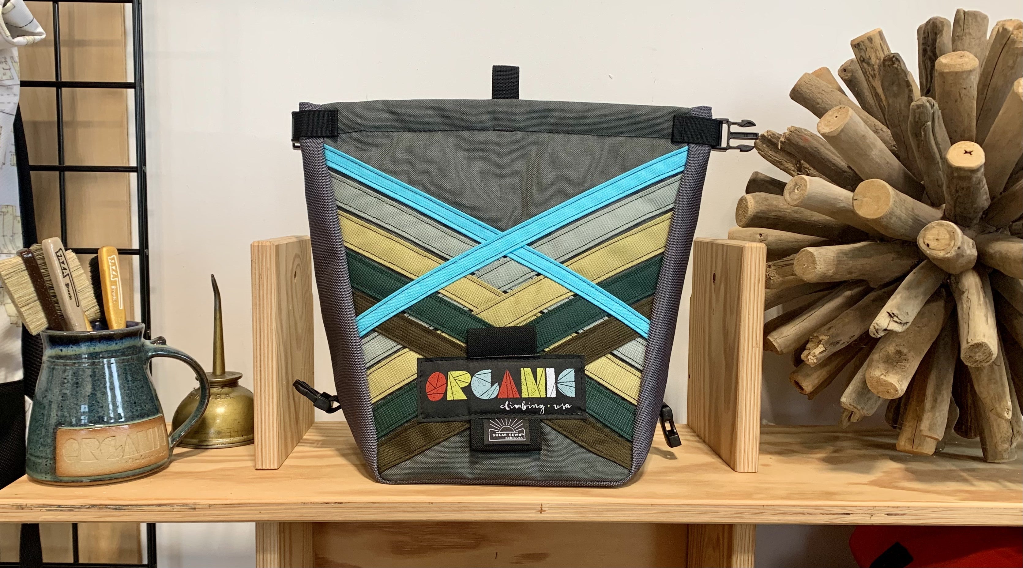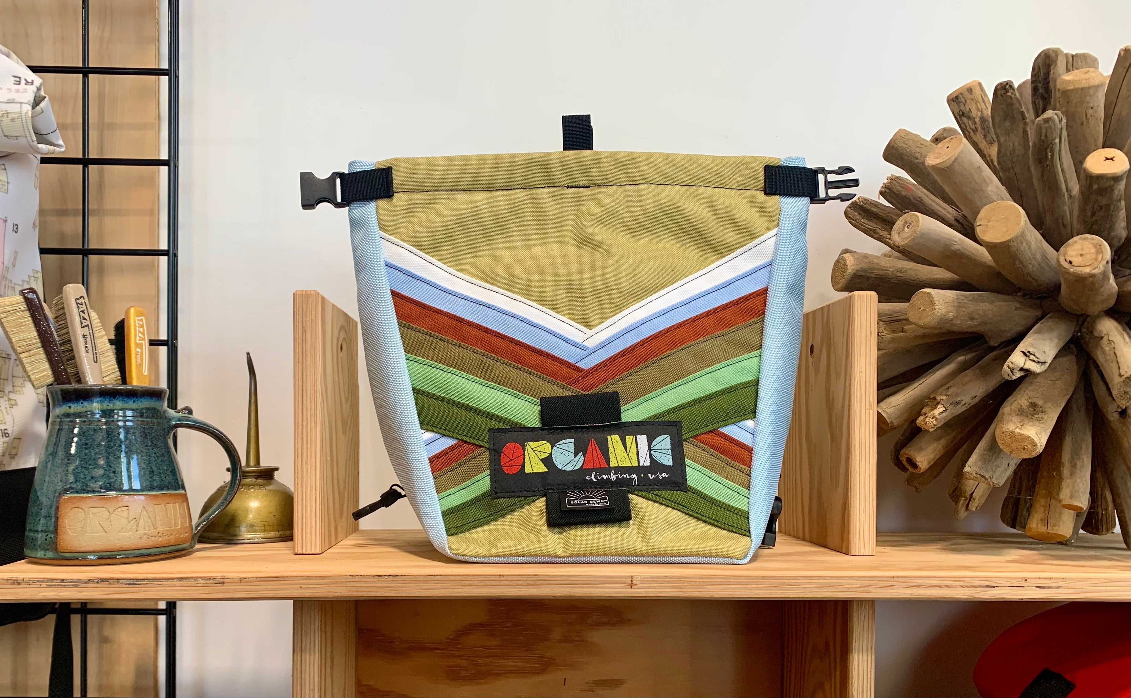 Developed through 14 years of feedback from devoted ORGANIC users worldwide! Our Deluxe Chalk Bucket has many tricks up its sleeve! Constructed of burly and colorful 1200d Recycled Cordura with a wrap around panel (sides and bottom) of indestructible 1050 Ballistic Nylon for added durability and stiffness along the bottom and sides of the bag. 2 Horizontal brush holders on front of bag for standard size brushes and 2 vertical sewn pockets on the back for larger, thicker handled brushes. Double pocket (One with zipper with ample room for wallet, phone, keys etc) and a shove it style pocket build in behind the zippered pocket, designed to hold phone upright when utilizing training apps etc, and with sewn in brush slots to keep your brushes at the ready. Super soft fleece lined throughout bag, large bar tack reinforced grab handle on back of bag for easy grabbing between burns. 1" Hook and Loop closure along the rim, Rolls down and securely clips closed to seal chalk in tight!